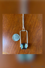 one of our favorites! unique handmade crystal necklace. A square blue crystal, wire wrapped and set in a hand forged silver rectangle frame.