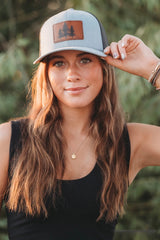 just in.... 3 pines Trucker Hat with a perfect blend of style and outdoor spirit. Featuring a high-quality leather patch stamped with three pine trees, this hat captures the essence of nature and adventure. The breathable black mesh back and adjustable snapback ensure a comfortable fit for all-day wear, while the classic gray trucker design adds a timeless, laid-back vibe.