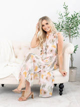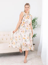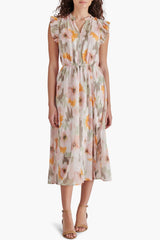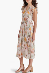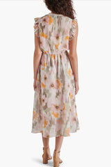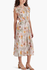 move gracefully in this chiffon midi dress designed in a dreamy blurred floral print with fanciful frilly trim.