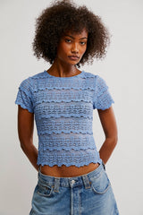Features: Lace and mesh fabrication, striped pattern, short sleeves, crew neckline, scalloped trim