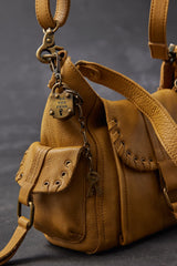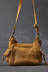 Features: Mini size, metal hardware, intentionally distressed leather fabrication, buckle-detailing, removable and adjustable straps
