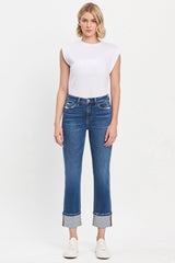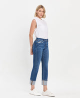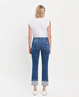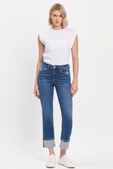 Meet your new favorite pair of jeans! These High Rise Cuffed Slim Straight Jeans feature a darker wash and slightly distressed detail making it perfect anytime or any occasion. Pair with a sweatshirt for a cozy look, or dress it up with heels for a night out!