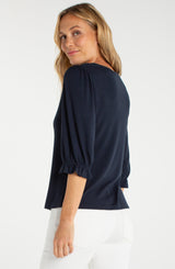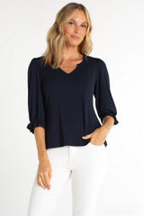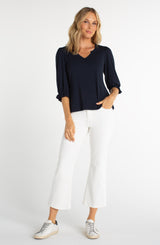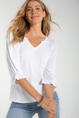The not so basic basic! This elbow sleeve tee comes with a little wink at the cuff thanks to a notch detail that gives everyday styling a playful edge. Mini rib texture keeps things sleek while the V-neck brings just the right amount of polish.