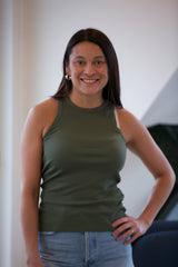 Looking for a simple yet chic update? This timeless tank has got you covered. Designed with a higher neckline and made out of supple ribbed fabric, this tank should be your go-to. It'll be ours!