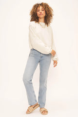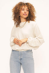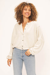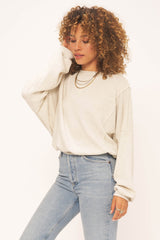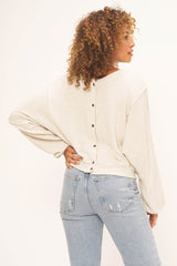The Mya Reversible Oatmeal Cozy Long Sleeve features a touchably soft brushed fabric, rib inset details, drop shoulders, sleeve cuffs, bottom hem band, relaxed fit, and antiqued brass button closures. Wear with the buttons in the front for a feminine cardigan look, or flip it around for unexpected back detailing