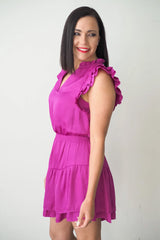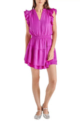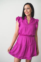 The prairie dreams mini dress pairs a tiered skirt with a ruffled collar and ruffle cap sleeves. Stretch smocking cinches the waist and a split V-neck finishes the look.