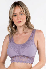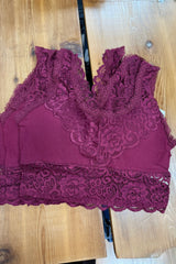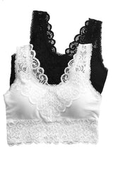 padded lace bralette with a pretty rounded neckline, scallopped edges and an allover floral lace design is the perfect layering piece!  the back features a beautiful lace v-hemline.