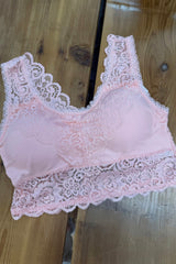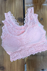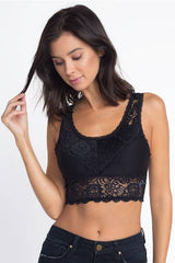 padded lace bralette with a pretty rounded neckline, scallopped edges and an allover floral lace design is the perfect layering piece! the back features a beautiful lace v-hemline.