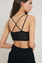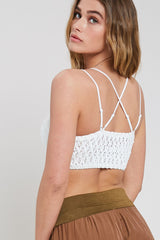 scalloped lace cami bralette with removable bra pads, crisscross straps at back, and adjustable bra straps