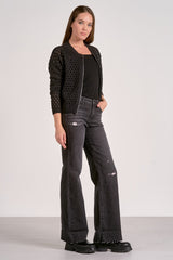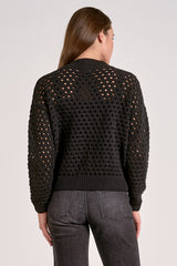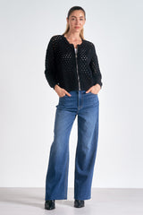 Zip into style with this cut out cardigan. Crochet detailing and a bomber jacket silhouette merge comfort with edge for a uniquely cool layering piece.