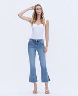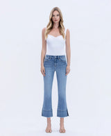 These high rise kick flare jeans combine expert tailoring with modern comfort. Crafted from stretch denim, they offer a flattering fit that moves with you. The cropped length and subtle trouser slit hem add a polished yet contemporary edge, making them ideal for both professional settings and casual ensembles.