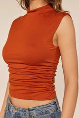 A wardrobe essential with a modern twist, where minimalism meets statement style. This sleeveless top features a high neckline for a polished touch, while side ruching creates a figure-flattering silhouette. Soft, stretchy, and versatile—this top is your new go-to for everyday wear with a bold edge.