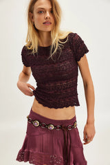Features: Lace and mesh fabrication, striped pattern, short sleeves, crew neckline, scalloped trim