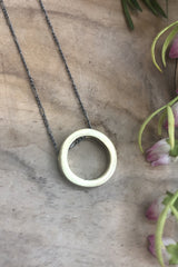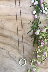 Simplicity is this design's middle name. A single brass circle pendant is suspended from a 16-18 inch delicate necklace for the ultimate ode to minimalistic style.