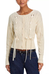 This playful design features a crew neckline and long sleeves, as well as a charming ribbon detail and front tie. The cable knit adds a touch of cozies to this cardigan. Perfect for wearing solo or layering adding some flair to your outfit!