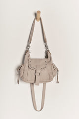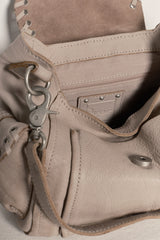 Features: Mini size, metal hardware, intentionally distressed leather fabrication, buckle-detailing, removable and adjustable straps