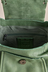 Features: Mini size, metal hardware, intentionally distressed leather fabrication, buckle-detailing, removable and adjustable straps