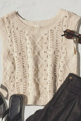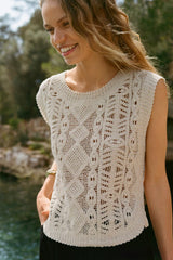 This structured sleeveless sweater is knit in an airy, engineered crochet pattern with a crew neckline and a softly rounded hem. The relaxed fit and open stitch work give it a breezy, modern feel you’ll keep reaching for.