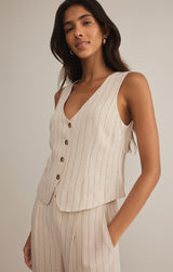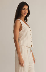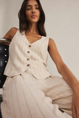 Fitted and effortlessly cool, this textured linen vest features a v-neck and button-up silhouette. Perfect layered or styled solo, it’s a modern take on timeless tailoring.