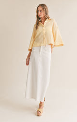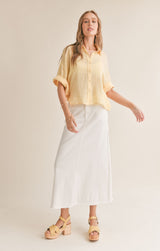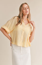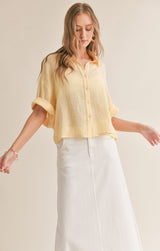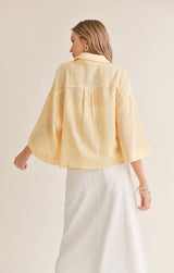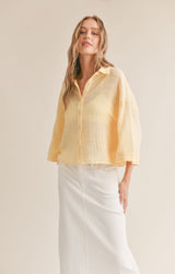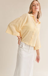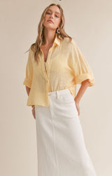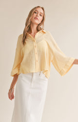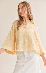 lightweight cotton fabric shapes this oversized shirt with a collared neckline and 3/4 length bell sleeves that can be cuffed.  wear it over a tank and shorts for a casual look or dress it up layered over a dress.
