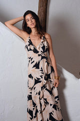 this is an absolutely stunning dress! long floral print maxi dress with spaghetti straps, ruffled crossover neckline, open lace-up back and asymmetrical flounce on the skirt.