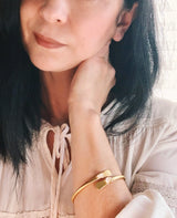 A solid brass cuff has been paired with Herkimer Diamonds for a unique bohemian bracelet. Great for layering or wearing on its own.