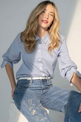 Crisp, classic, and effortlessly refined, this pinstripe shirt brings timeless polish to your wardrobe. Designed with fine blue and white stripes, the lightweight fabric drapes beautifully and feels soft against the skin making it perfect for layering or wearing solo.