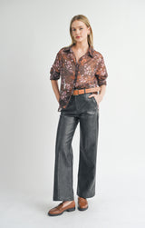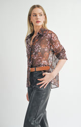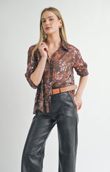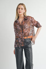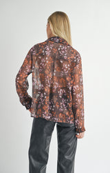 This is a lovely on trend sheer button down shirt with a pretty autumn floral design. The subtle colours in the print include a classy mix of lavender, copper and rich brown.