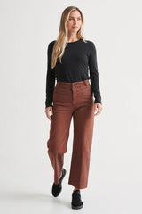 An elevated trouser designed with a High Rise and wide leg to flatter any body type. Crafted from cotton and infused with the perfect amount of stretch, this pant is versatile, sophisticated and comfortable. Fits high on the waist with a slim hip and relaxed thigh and wide leg opening