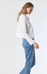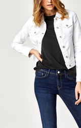 Clean and bright, this classic white jean jacket in ultra-stretchy, sustainable fabric is as comfortable as it is versatile and stylish for a closet staple that’s perfect during crisp summer nights.