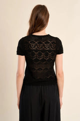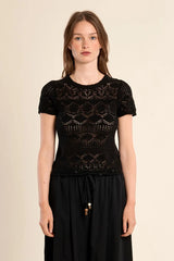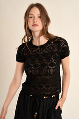 Effortlessly chic with a boho twist!  This semi-sheer crochet knit jumper features an intricate ethnic pattern, short sleeves, and a classic round neckline. Its lightweight, straight-cut design makes it perfect for layering over a cami or pairing with high-waisted denim for a relaxed yet stylish look. A must-have for breezy days and effortless styling!