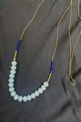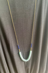 Fantastically foreign and subtly alluring, this necklace embraces the unique color of Persian light blue and deep blue crystals, while remaining a neutral sophistication with brass and hematite accents on a 32” chain for flexibility.