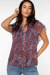this lightweight blouse features a double-layered chiffon design, complete with stunning prints and flutter sleeves. It is ideal for layering under a denim jacket, or can be worn on its own for a stylish look.