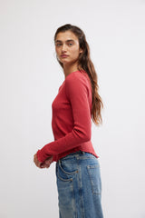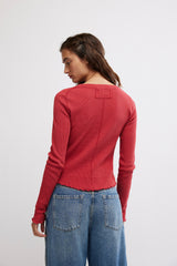 So essential from free people we the free collection, this long-sleeve is featured in a soft waffle-knit fabrication and relaxed fit with raglan-cut sleeves and lettuce-edge trim.