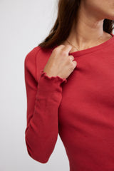Features: Waffle-knit fabrication, crew-neckline, raglan-cut long-sleeves, lettuce-edge trim, seam detail throughout