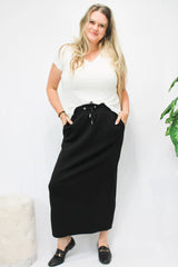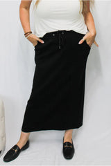 Elevate your style with the Erza scuba knit Drawstring Skirt.  this soft knit easy-to-wear skirt offers both comfort and versatility. Pair it with your favorite tops and elevate any outfit effortlessly. Chic and timeless skirt that can be worn all year long.