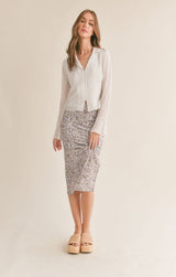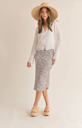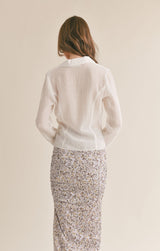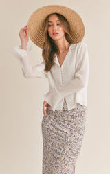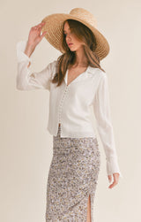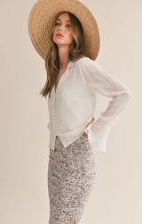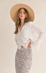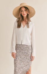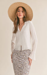 never underestimate the power of a white shirt ladies! this beautiful flowy v-neckline blouse features covered buttons down the front with romantic sleeves that has button detail with a ruffled cuff. sheer?, not at all as the front of the blouse is lined on the inside. pair it with a floral skirt or dress it down with your favorite jeans.