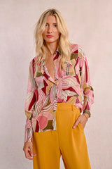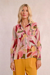 A blouse that brings the fun!  Swirls of pink in an geometric print give this button-up a bold, artsy feel, while the semi-transparent fabric keeps things light and airy. Finished with a sharp collar, patch pockets, and long sleeves, it’s the perfect mix of structure and spontaneity—just like your style.