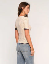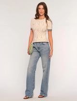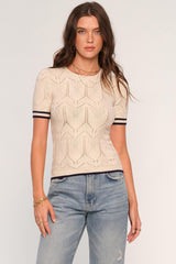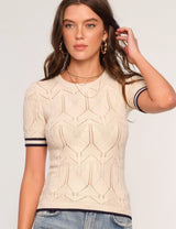The Halton Top is a cute, spring knit for any occasion. It features a geometric stitch pattern, and contrast tipping at the sleeve opening. It has a slim fit, which makes it perfect for wearing with your favorite jeans.