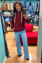 The hoodie features two side pockets, thick hood, leather detail, and rope cords. A great addition to your fall wardrobe.