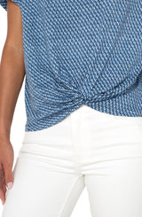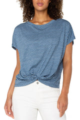 Level up your wardrobe with this crew neck dolman knit top featuring a twisted front detail. This fun Liverpool print adds an effortless touch of style to any outfit.