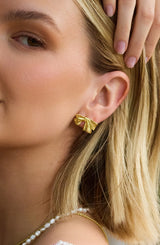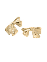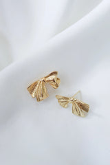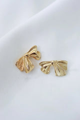 - The earrings feature a gold-tone bow with a central knot adorned with a finely ribbed texture for a shimmering effect.