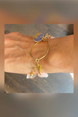 It comfortably stretches to fit any size and has a gold plated lobster clasp. This clasp can connect to the hammered connector, or the extender chain that dangles the crystal quartz. The hammered connector is made with tarnish resistant wire hand hammered and worked to harden. Comfortable, no pinching.