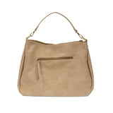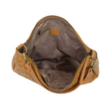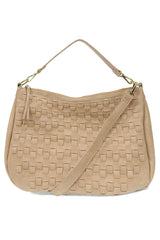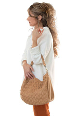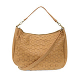 Embrace your cool with this bohemian style hobo bag in a contemporary woven pattern. The buffalo grain has an authentic leather look but is crafted in earth friendly vegan leather.  Equipped with 2 shoulder straps to wear as a short shoulder or a crossbody bag when you want to be hands free. With a rear back zip pocket, multiple interior pockets and accented with our signature Joy zip pull on the top zipper closure you will be organized on the go.