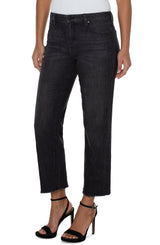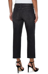 Dramatic fraying at the hems accentuates the ankle-grazing fit of straight-leg jeans fashioned from subtly faded denim with just a hint of stretch.