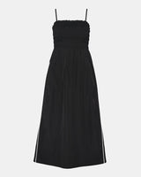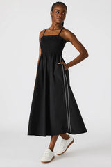 Expertly designed for comfort and style, the Kit dress is the perfect addition to your wardrobe. The flowy maxi dress features sleek stripe detailing, while the pull-on style and adjustable straps provide a customizable fit. The smocked top adds a touch of flair and versatility to this must-have piece.