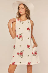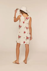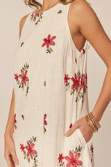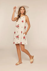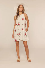 The perfect mini dress designed with a cute red and ivory floral print. Relaxed A-line silhouette, complete with practical side pockets and a high curved neckline.