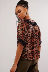 So bold blouse featured in a playful printed fabrication and relaxed fit with feminine lace trim and button-front closures.