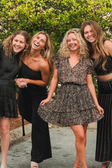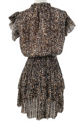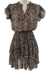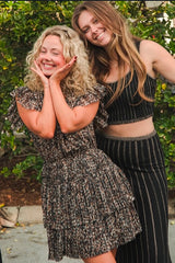 indulge in the luxurious feel of our nora dress. The short ruffle sleeves and neckline adorned with a front tie exude feminine charm, while the elastic waist creates a flattering silhouette. The layered ruffle skirt adds texture and movement to the mini dress with subtle metallic stripe detail. Perfect for any occasion, this mini dress is a must-have for your wardrobe.