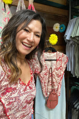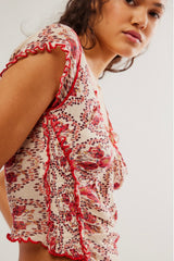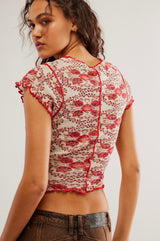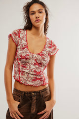 Just as versatile as it is vintage-inspired, perfectly printed tee is featured in a fitted, slightly cropped silhouette with defined lettuce-style trimming throughout for an added dimensional style.